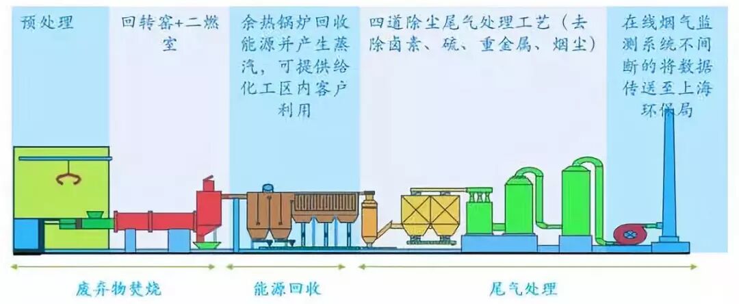 工厂配备两套回砖窑焚烧装置和一套立式喷射炉焚烧装置,废料进入焚烧系统前首先经过预处理,然后经过回转窑焚烧固、液、气体废料,没有完全燃烧的烟气经过二燃室,焚烧温度大于1100℃,停留2秒钟。余热锅炉回收热量,产生蒸汽。尾气经过急冷器、袋式过滤房、酸洗塔和碱洗塔的处理排放,符合最新的欧盟标准以及上海市自2016年7月1日执行的新标准。