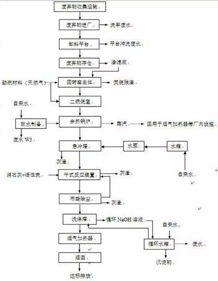 本项目危废焚烧包括进料系统、焚烧系统、助燃系统、换热系统、尾气处理系统、灰渣处理系统、电气控制系统等。焚烧系统由两部分组成:一燃室和二燃室。固体废物经给料装置送入回转窑内(一次燃室),液体废物经加压泵喷入炉内雾化燃烧。残渣自窑尾落入渣斗,由出渣系统连续排出。燃烧产生的烟气从窑尾进入二次燃烧室高温燃烧,燃烧温度1100℃以上,停留2秒以上。在二燃室充分燃烧的高温烟气经余热锅炉回收热量,将热能转换为热水和蒸汽,烟气温度降至530℃。然后经急冷塔快速冷却至180℃,防止二恶英再合成。